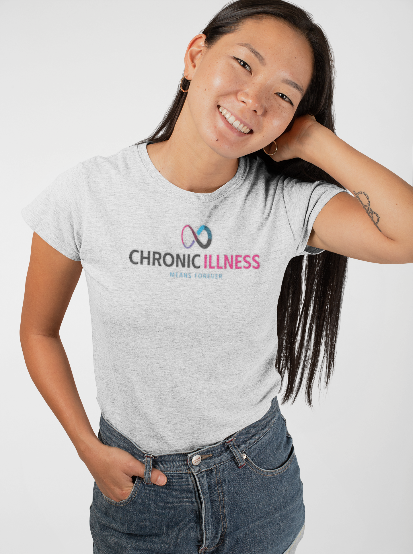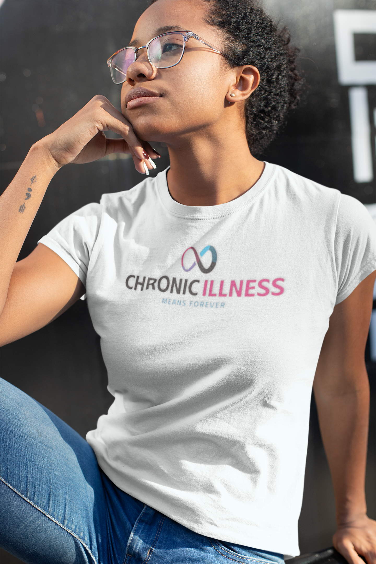 This shirt features an infinity symbol intertwined with the words “Chronic Illness – Means Forever”, symbolizing endless strength and resilience. The infinity symbol reflects the unending journey faced by those living with chronic conditions, while the phrase “Means Forever” highlights the continuous courage and fortitude required every day.