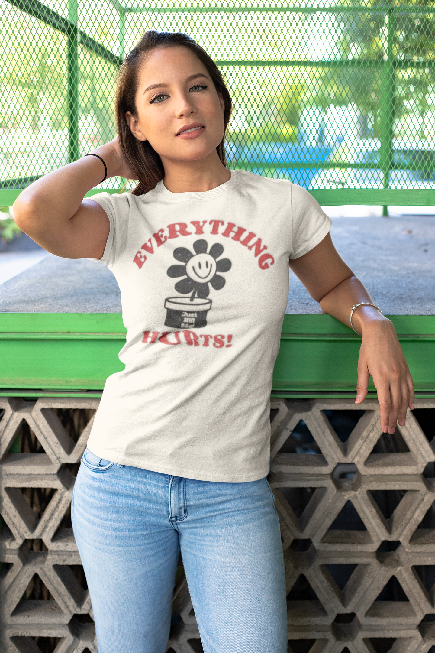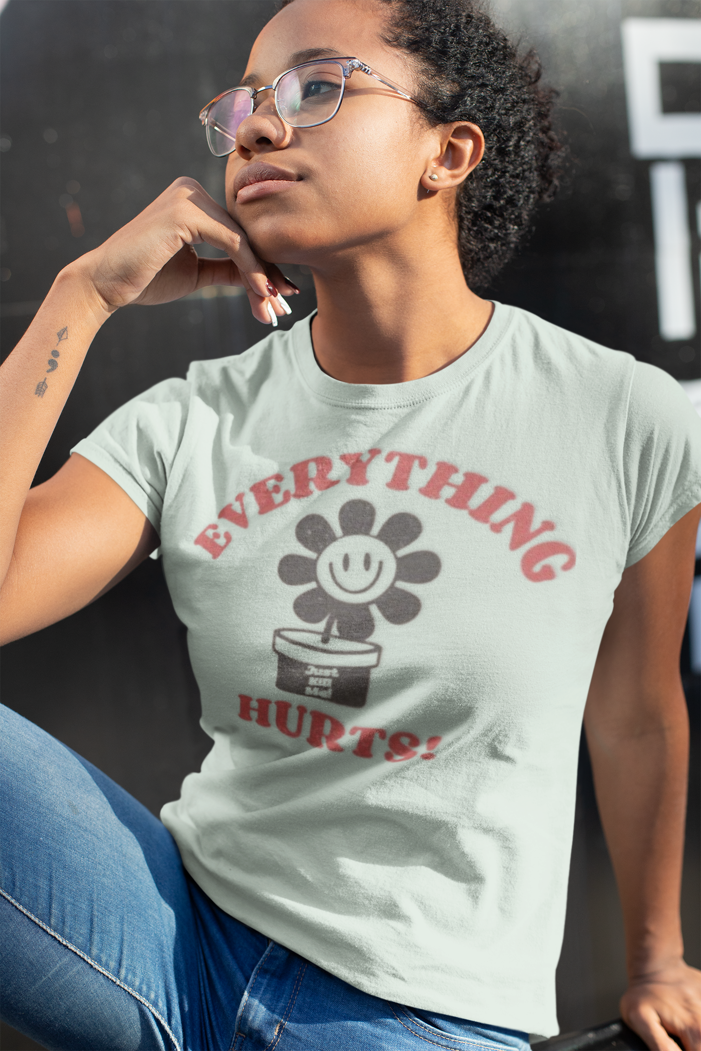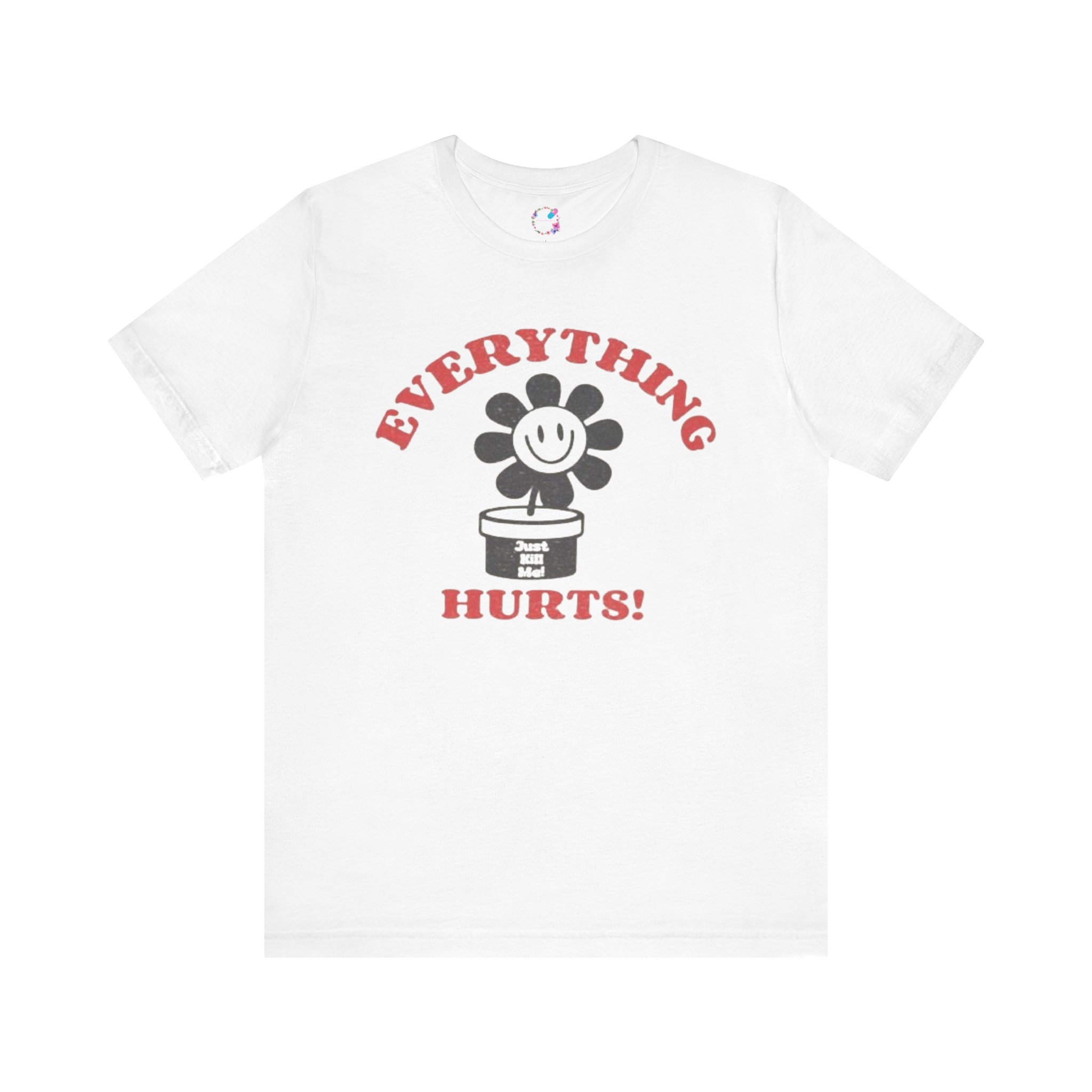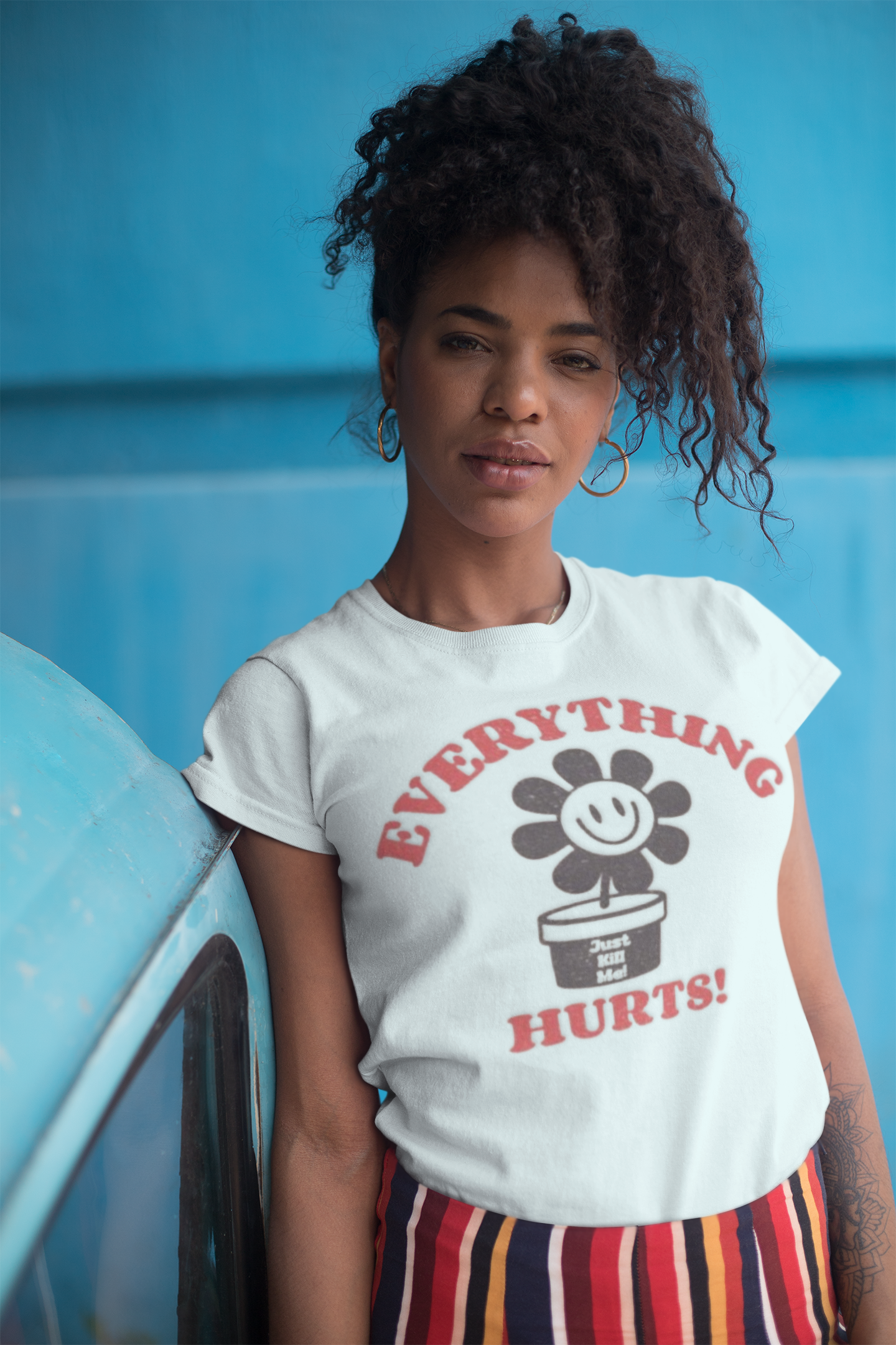 Express your daily struggles with humor in the “Everything Hurts” T-shirt. Featuring a cheerful smiling flower paired with a painfully relatable phrase, this shirt captures the reality of chronic pain in a way that’s both lighthearted and eye-catching. It’s the perfect way to connect with others who understand while spreading awareness through a touch of humor.