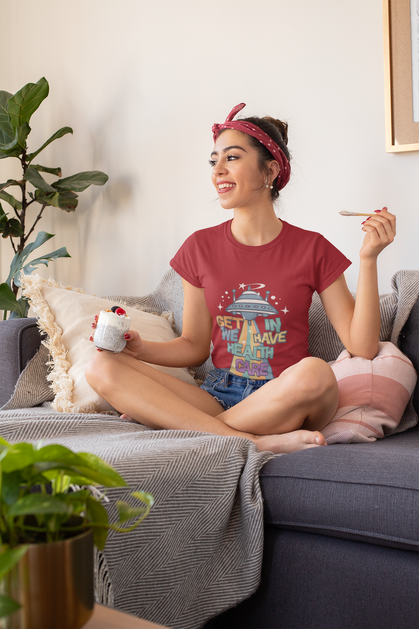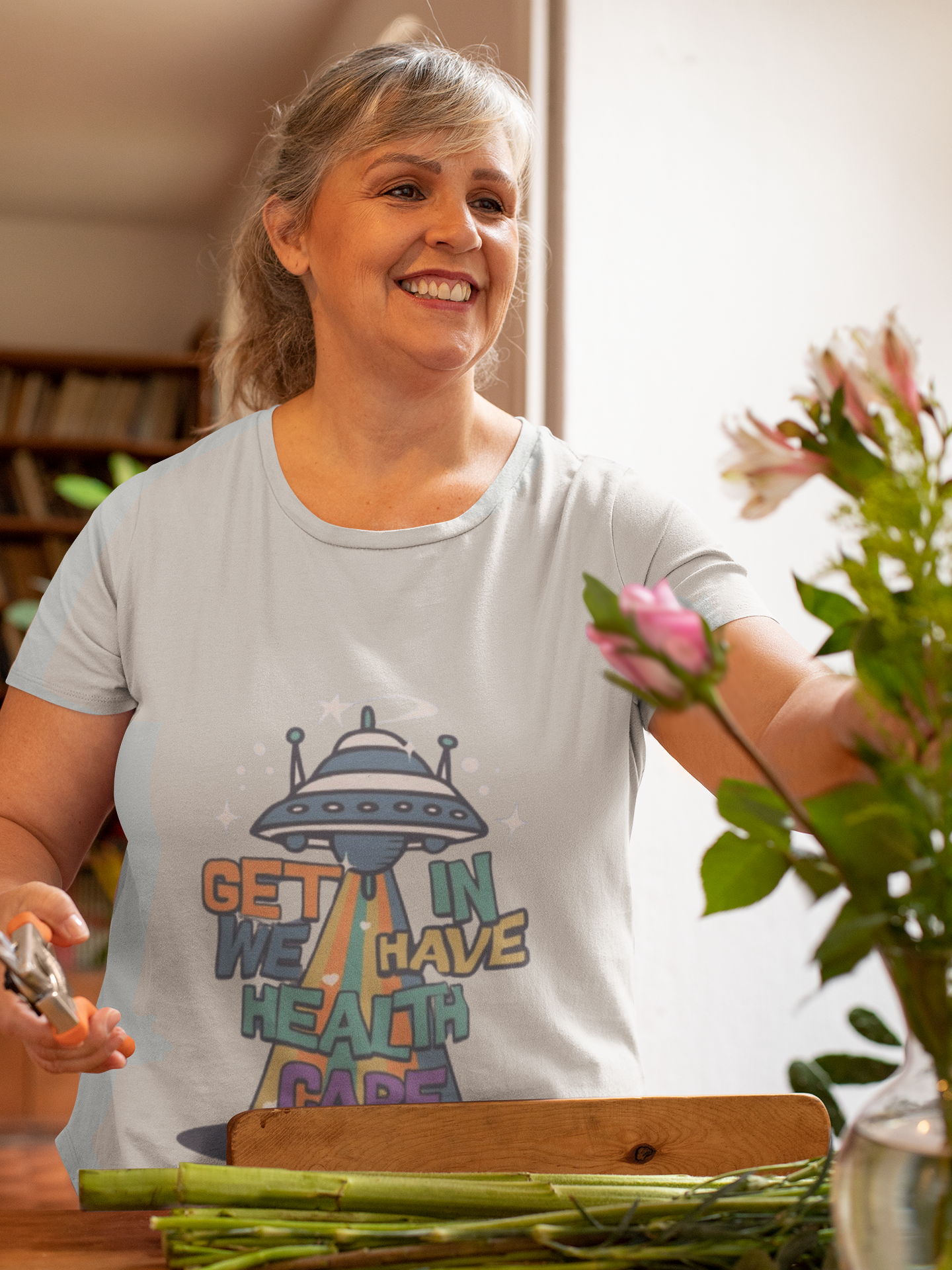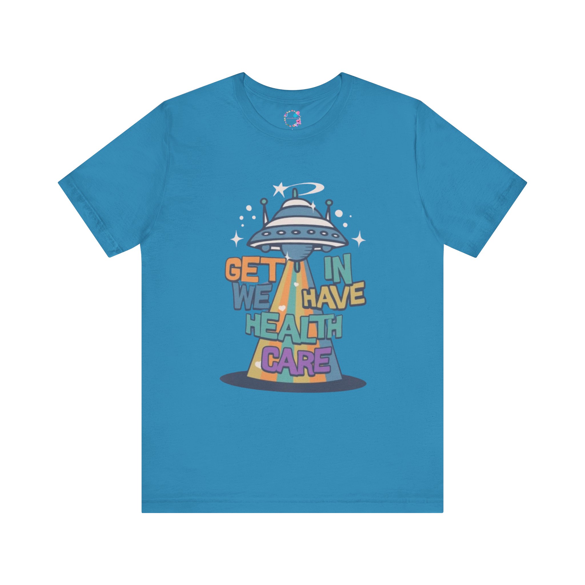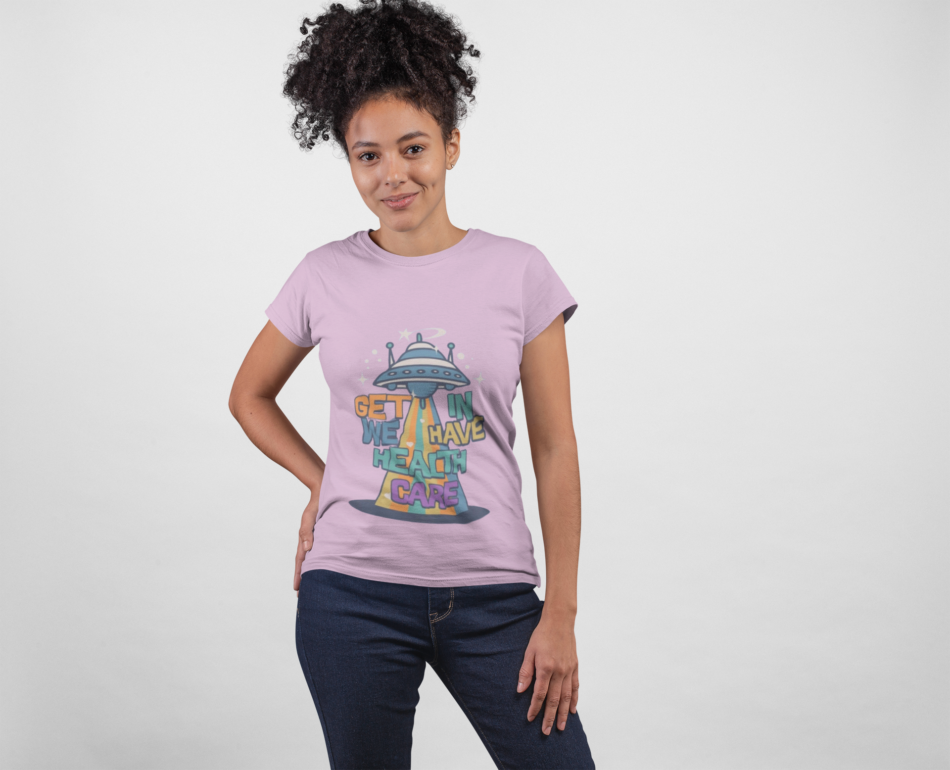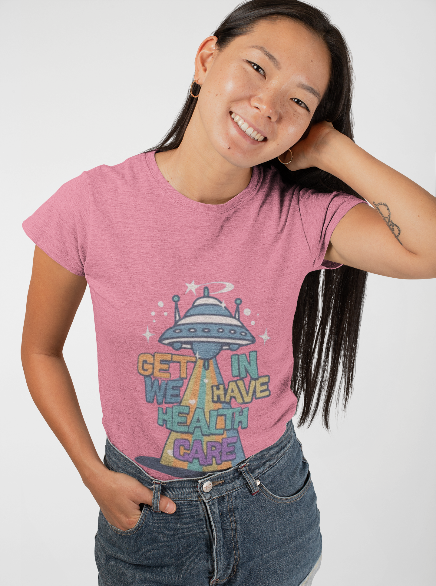 Combine humor and advocacy with this “Get In, We Have Healthcare” T-shirt. Featuring a playful UFO and colorful text, this shirt is perfect for sparking conversations about healthcare accessibility and raising awareness in a fun and engaging way. Imagine a world where aliens come to save the day with universal healthcare—this shirt captures that whimsical idea while making a statement about the importance of accessible healthcare for all!