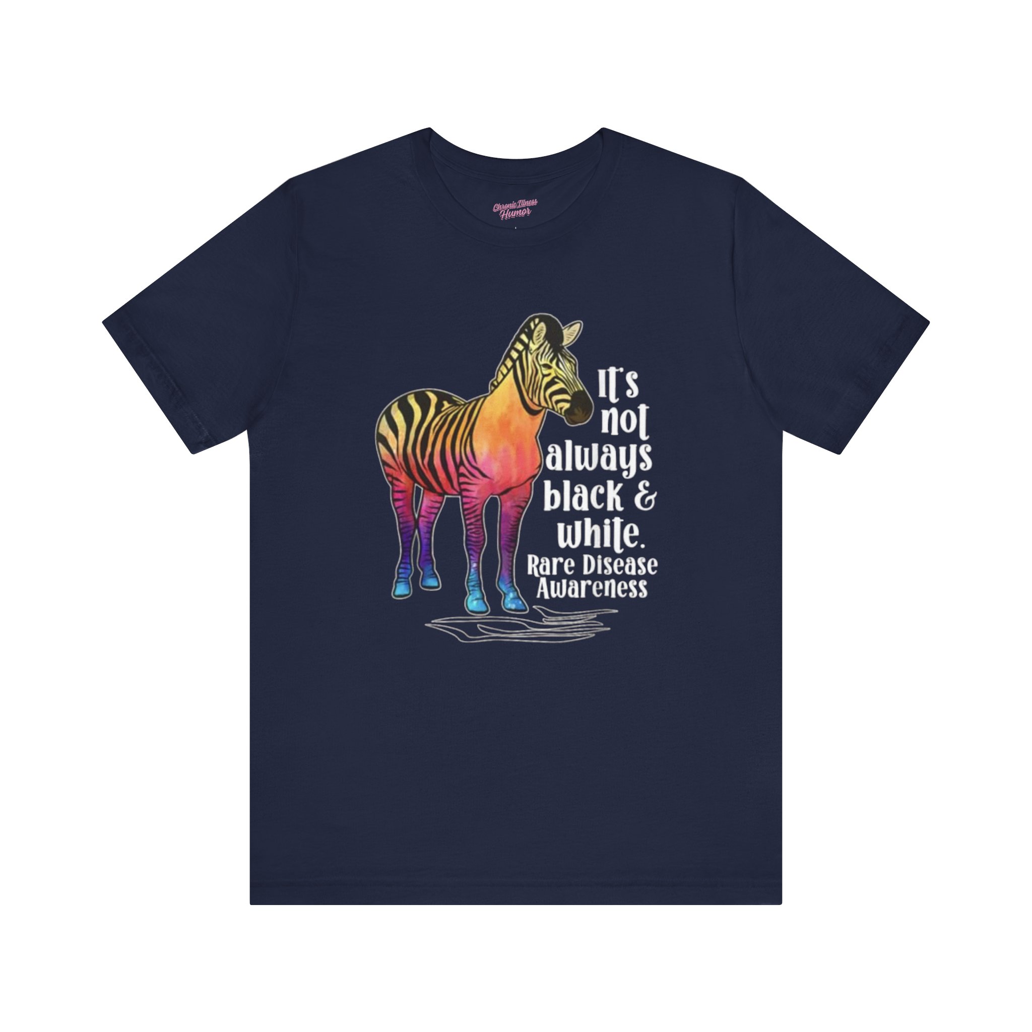 Show your support for the rare disease community with this bold and colorful “It’s Not Always Black & White” T-shirt. Featuring the zebra—an international symbol for rare disease awareness—this design reminds us that not every illness is straightforward or easy to see. With its vibrant rainbow gradient, it’s a beautiful way to spread hope, strength, and awareness.