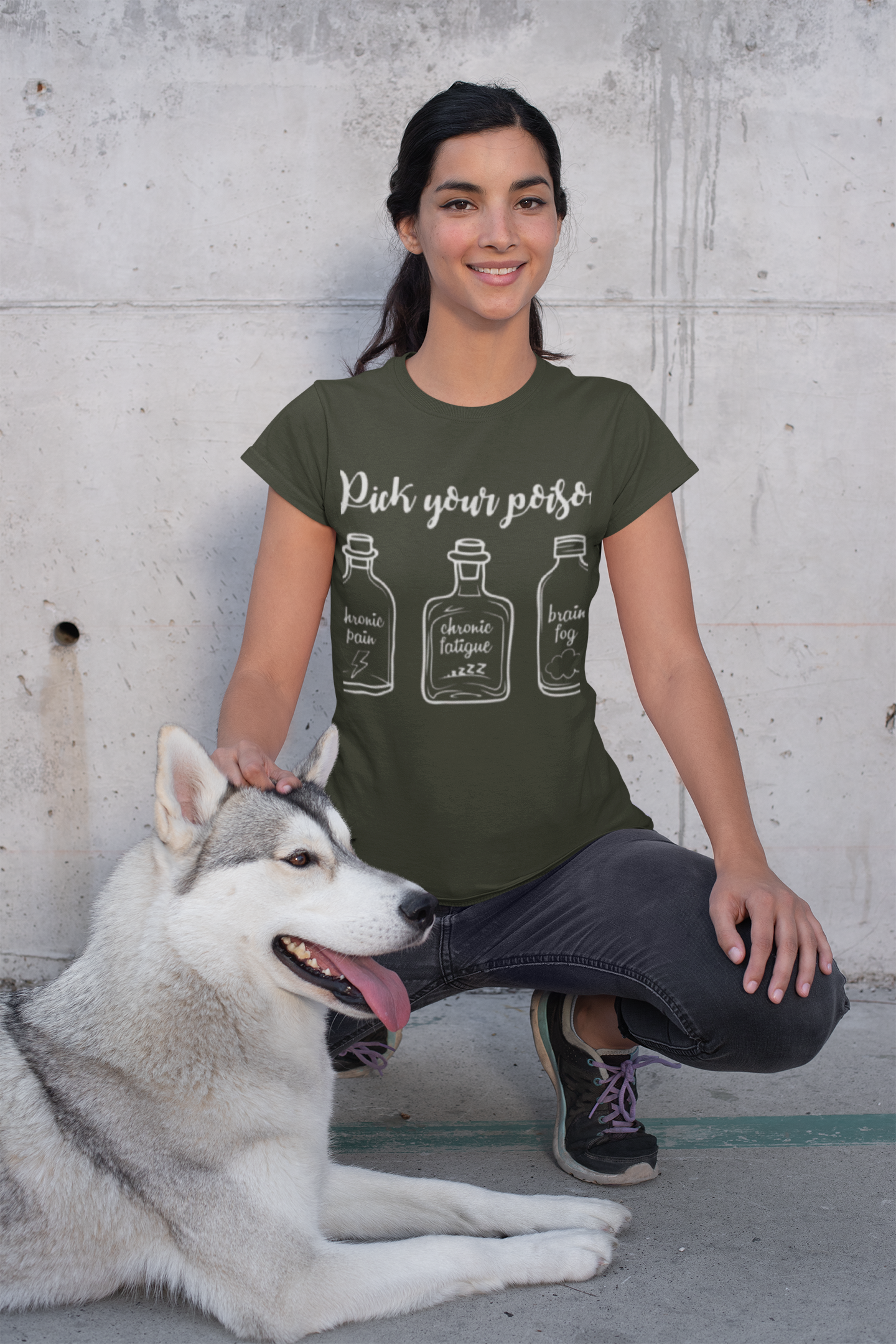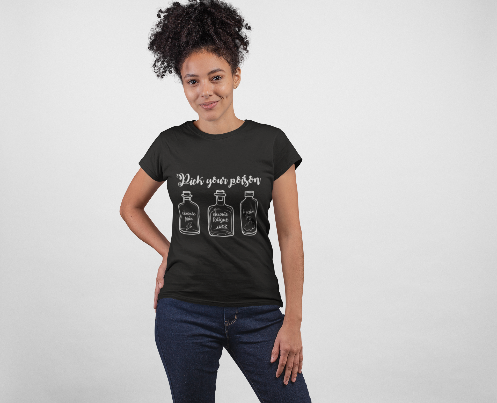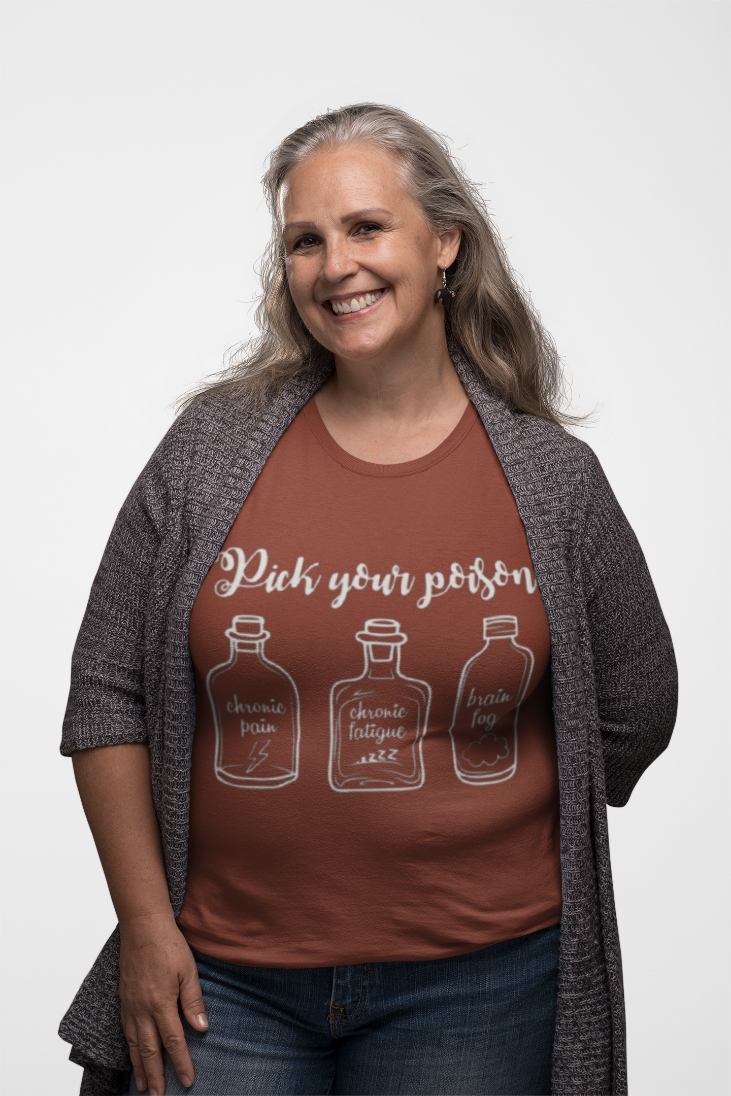 Embrace the reality of living with chronic illness and raise awareness with this “Pick Your Poison” T-shirt. Featuring a whimsical design with three bottles labeled Chronic Pain, Chronic Fatigue, and Brain Fog, it humorously captures the daily struggles faced by many. This shirt is a lighthearted way to connect with others who understand and to spark meaningful conversations about the challenges of managing multiple chronic symptoms.